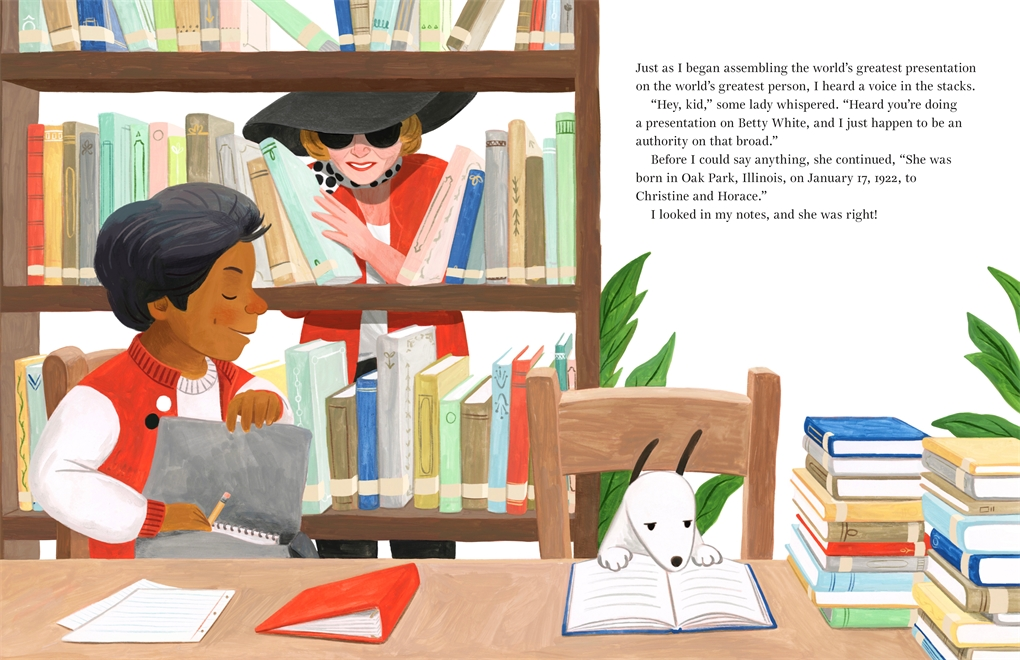 Summary: When the narrator gets assigned to do a project on a trailblazing woman, he chooses Betty White. Not everyone is thrilled with his decision: his teacher and one of his dads keep asking, “Wouldn’t you rather choose someone more…traditional?” But his mind is made up, and off he goes to the library to do his research. A woman in sunglasses and a big hat gives him some help, adding some details about Betty’s early career as an actress and producer and continuing to her fame in The Mary Tyler Moore Show and The Golden Girls. His presentation turns out to be a smashing success, and the mysterious lady is there to cheer him on. As the crowd in school watches her drive off in a red convertible, it suddenly dawns on them: “That’s Betty!” Includes a timeline (which sadly ends with the 2022 entry “Betty turns 100 years old!”), photos, and a list of sources. 48 pages; grades 1-5.