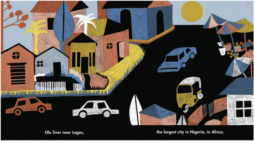 Summary: Olu and Greta are cousins who have never met, since Olu lives in Lagos, Nigeria, and Greta is from Milan, Italy. How would they get together? It’s too far to walk, skate, or dance, and they don’t know how to fly or operate a spaceship. It’s possible to take a boat or plane, but that hasn’t happened yet. So they send each other packages and talk through their computers to share their lives long-distance. The final illustration shows them as teenagers taking a selfie. 32 pages; ages 3-8.