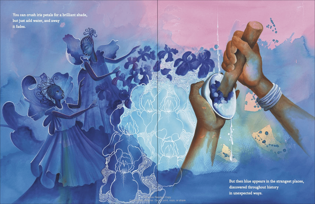 Pros: Here’s a fascinating history of something I had no idea had a fascinating history: the color blue. Kids will have a greater appreciation for blue jeans and other commonplace items after reading about the struggles and high value associated with blue. The gorgeous illustrations feature many different colors but appropriately highlight blue.