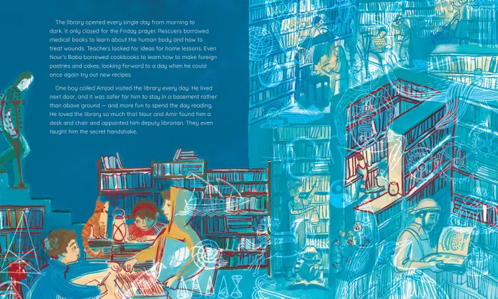 Summary: Nour and Damir are cousins living in Syria with big plans to start a secret society for themselves and their friends. Those plans are destroyed when the war moves to their city and they have to hide in a basement. During lulls in the fighting, Damir goes out on his bike to look for food and begins to rescue books that he finds in the rubble. The kids find an empty basement in a mostly-abandoned building and set up a library there. With the help of neighbors, they build shelves and move their books into the basement. Before long, people are coming from all over the city to borrow books. Reading and books provide a respite for people as they endure the long war. Includes a glossary, information about Syria, a list of 8 famous libraries in the Middle East, information about the real secret library, and notes from the author and illustrator. 32 pages; grades 1-5.