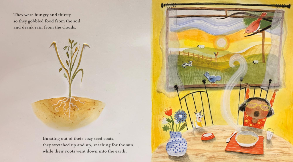 Summary: Oatmeal, blueberries, and milk may seem like a ho-hum breakfast, but there is magic in the foods we eat. The oats and the blueberries grew out of the soil, warmed by the sun, and watered by the rain. They make food from sunlight, creating seeds which can be used to grow new plants. The cow was able to make milk because she ate grass that grew with the help of sun and rain as well. “Inside everything, if you look deep enough, you will find the sun. Warm-hearted. Generous. Giving.” Includes additional information about photosynthesis. 32 pages; grades K-3.