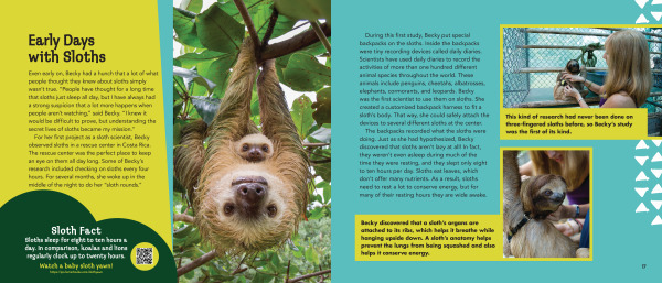 Summary: Wildlife photographer Suzi Eszterhas teams with Dr. Rebecca Cliffe (a.k.a. Dr. Sloth or Becky) to introduce kids to sloths, including different sloth species, their habitats, diets, behavior, and babies. Readers learn about dangers to sloth, which mostly come from their interactions with the human world. Becky’s work is described, from her childhood interest in nature and biology to the groundbreaking techniques she has used to observe sloths, becoming one of the first scientists to study these animals in-depth. The organization she founded, Sloth Conservation Foundation, focuses on saving sloths in the wild, and readers get some tips on how they can help. Includes a glossary and additional resources. 40 pages; grades 3-6.