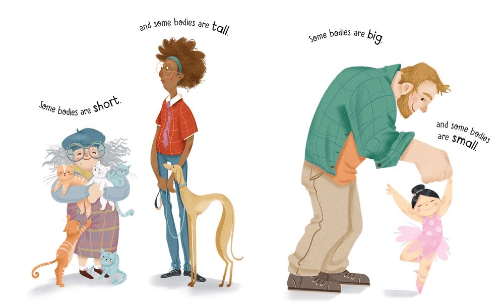 Pros: Both the text and the illustrations celebrate all kinds of bodies in a way that will both engage young children and encourage them to talk about what they notice about their own bodies and others’.