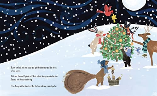 Summary: Bunny goes out the day before Christmas looking for a tree that is just her size. Along the way, she meets different animals who all have ideas about what makes the perfect tree: Squirrel says it should be bushy like his tail, Mole looks for a tree with a point like a mole’s nose, Cardinal thinks color is the most important ingredient, and Skunk says that it’s smell. Each tree Bunny finds lacks one of those characteristics. Finally, too cold to look any further, she heads for home. To her surprise, she discovers the perfect tree not far from where she lives. She runs to get her saw but can’t bring herself to cut the tree down. The animals get together and decorate their outdoor tree, then gather around it to sing carols. 32 pages; ages 3-8.