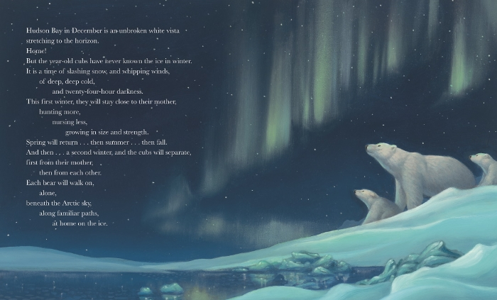Pros: Another breathtaking science book with poetic informative text and detailed realistic paintings of the polar bears and their environment. With a Sibert Medal and Honor on their resumé, this team can expect awards consideration again for this book.