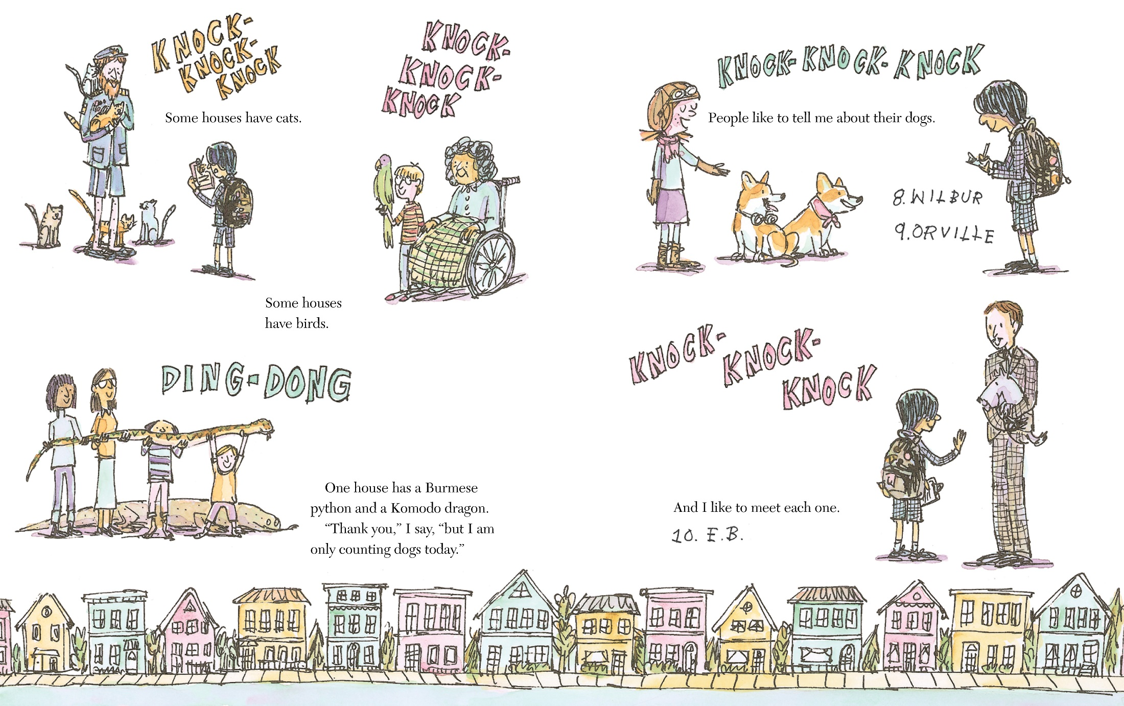 Summary: In Every Dog in the Neighborhood, a boy wishes for a dog. When his grandmother tells him there are enough dogs in the neighborhood, he decides to find out the exact number. Watching his grandmother write to city hall about an issue of her own, then get to work when she receives an unsatisfactory reply, the boy decides to do a dog census himself. As he knocks on doors and collects his doggy data, Grandma is seen working in an abandoned lot nearby. The boy learns there are 20 dogs in the neighborhood, but dog #20 needs a new home. He gets his dog, and all the dogs in the neighborhood get to enjoy the dog park that Grandma has created. 40 pages; ages 4-8.