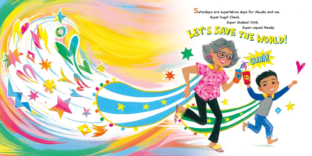 Summary: Luis loves Saturdays, because Abuela comes to visit and plays sidekick to his superhéroe. When his sister Isabel tries to join in, he pushes her away, telling her that she’s too little. One Saturday, though, Luis’s parents tell him that Abuela is in the hospital. They visit her there, but even after she comes home, Abuela isn’t “superhéroe ready”. Luis tries everything he can think of to help her feel better, but nothing works, and eventually Abuela tells him she has to hang up her capa. One day, Luis is with Abuela when he sees Isabel running around with both capas. At first, he tells her no, but then he notices Abuela’s eyes are shining “like estrellas.” He puts his own capa on Isabel and Abuela’s around his own shoulders, and the two of them become superhéroes who can push Abuela in her wheelchair. Includes a glossary of Spanish words. 40 pages; ages 4-8.