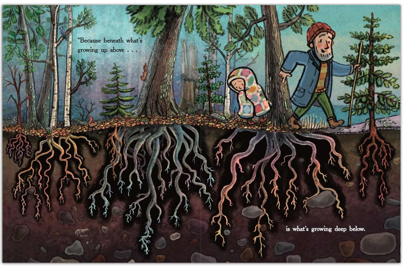 Summary: Finn is in a horrible mood, sitting on his bed completely covered by a patchwork quilt. Grandpa wants to talk, but Finn tells him that he won’t understand. Finally, Finn agrees to go for a walk, but only if he can stay underneath his quilt. “Don’t worry,” says Grandpa, “I’ll remember to think of what’s beneath.” As they walk, Grandpa points out that beneath the trees, there are roots; beneath the still water, there are fishing swimming around; beneath appearances are experiences, and beneath what’s different is what’s the same. “And sometimes,” says Grandpa, “Beneath someone who looks like they won’t understand…is someone who knows exactly how you feel.” The illustrations reveal that both Finn and Grandpa have broken hearts, maybe from the loss of the person who made the patchwork quilt. As night falls, the quilt is transferred from Finn’s head to Grandpa’s shoulders, and both of them are shown with hearts that are no longer broken. 40 pages; ages 4-8.