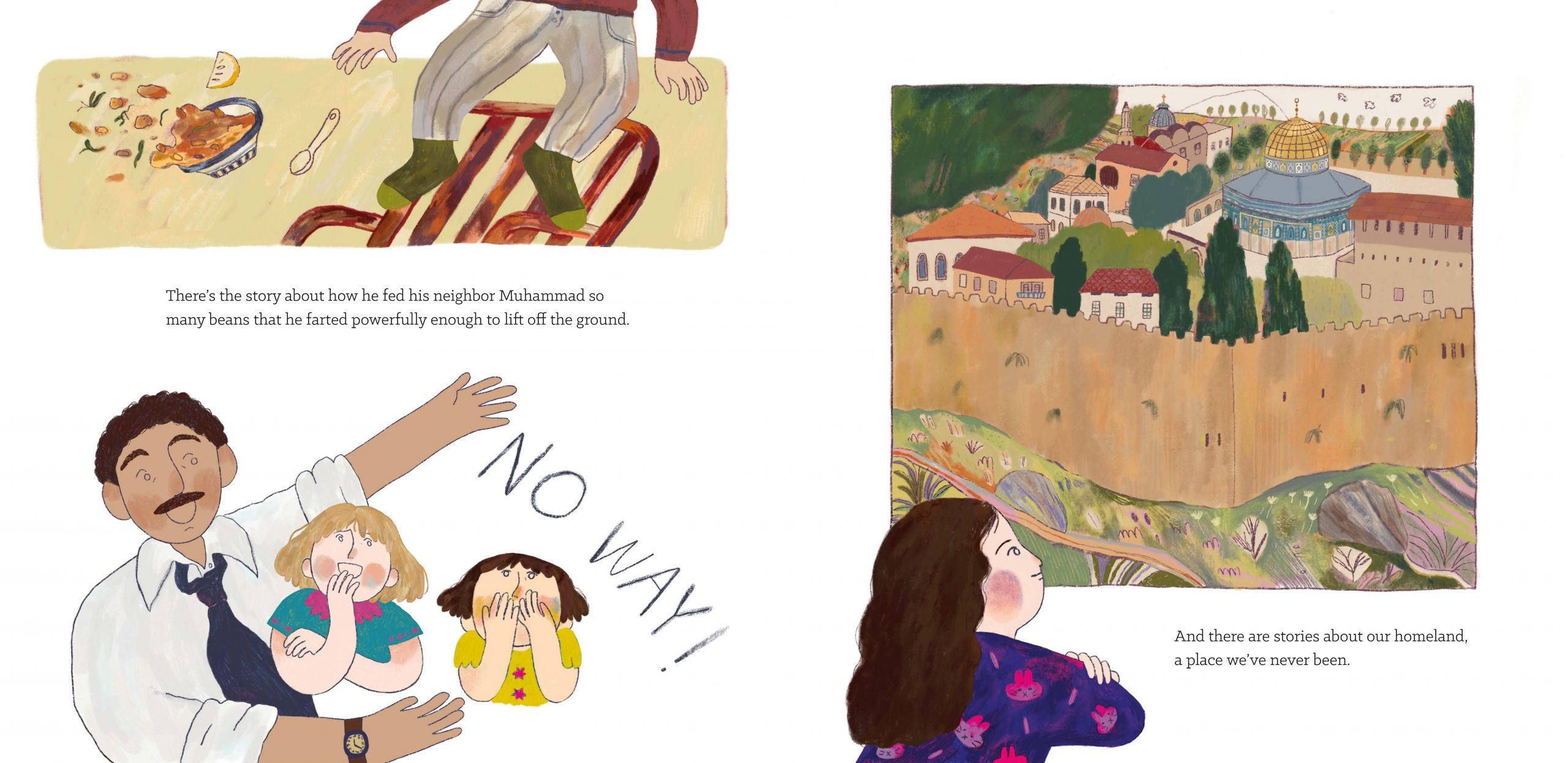 Pros:  The story and folk art-style illustrations bring to life the family’s homeland in Palestine and beautifully convey the sadness and longing they have to return there.