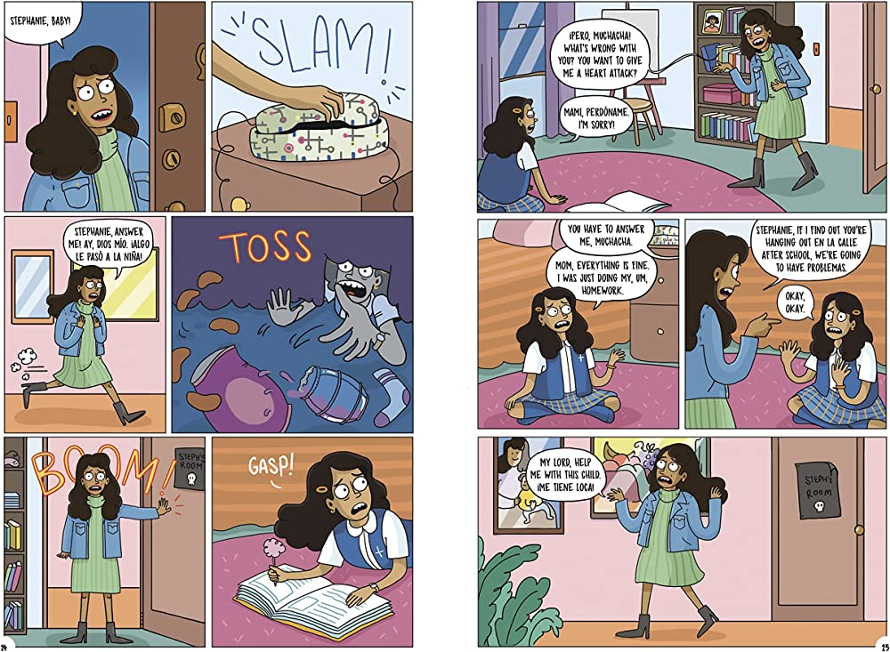 Summary: Steph is in eighth grade at her Bronx Catholic school, which means she and her friends are applying to New York City high schools. Her strict Dominican mother wants her to continue at a Catholic school near home, but Steph is drawn to an arts school in Manhattan. Since the school of her dreams requires a portfolio, not an exam, Steph decides to secretly work with her art teacher and mentor, Ms. Santiago, on a portfolio and to purposely fail the high school entrance exam. Naturally, this plan drastically backfires, and Steph finds herself in trouble with both her school and her mother. Fortunately, her mother, helped by her own mother, sits down and talks to Steph, resulting in a better understanding on both sides, and ultimately, Steph’s admission to the Laguardia Arts High School. Includes a note from the creator telling more about her own life and what was the same and different from the fictional Steph. 208 pages; grades 4-7.