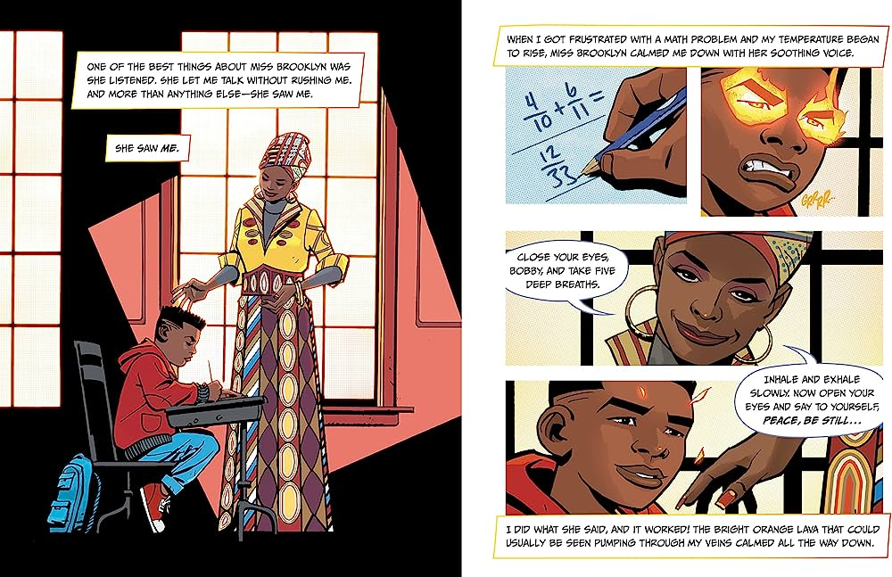 Pros: Fun comic book meets Black empowerment in this story of superhero kids learning to channel their powers for goods. Miss Brooklyn provides a great model for a compassionate teacher, showing the importance of listening and using empathy to reach kids. The cover and illustrations make this a book that will fly off the library shelves.