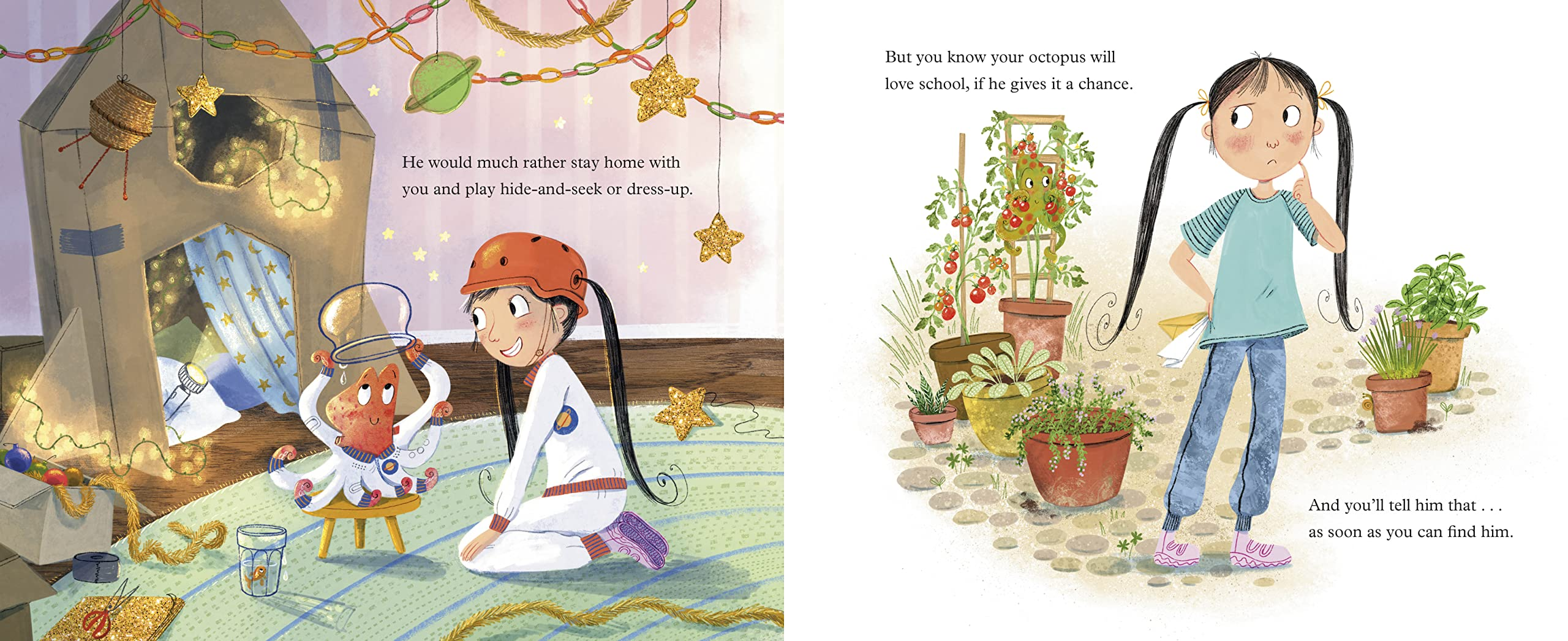 Summary: An octopus and a backpack are both dealing with first-day-of-school jitters. The octopus lives with a girl who’s trying to convince him that school is fun. Octopuses are shy, though, and also good at hiding. Once he’s been discovered, the two work together to find him a perfect outfit, a process that’s disrupted when the octopus’s nerves cause him to shoot a cloud of ink. They finally make it to school, and the octopus is excited to be with new friends. When it comes time to say goodbye, it’s the girl who has some trouble letting go. Includes ten facts about octopuses.