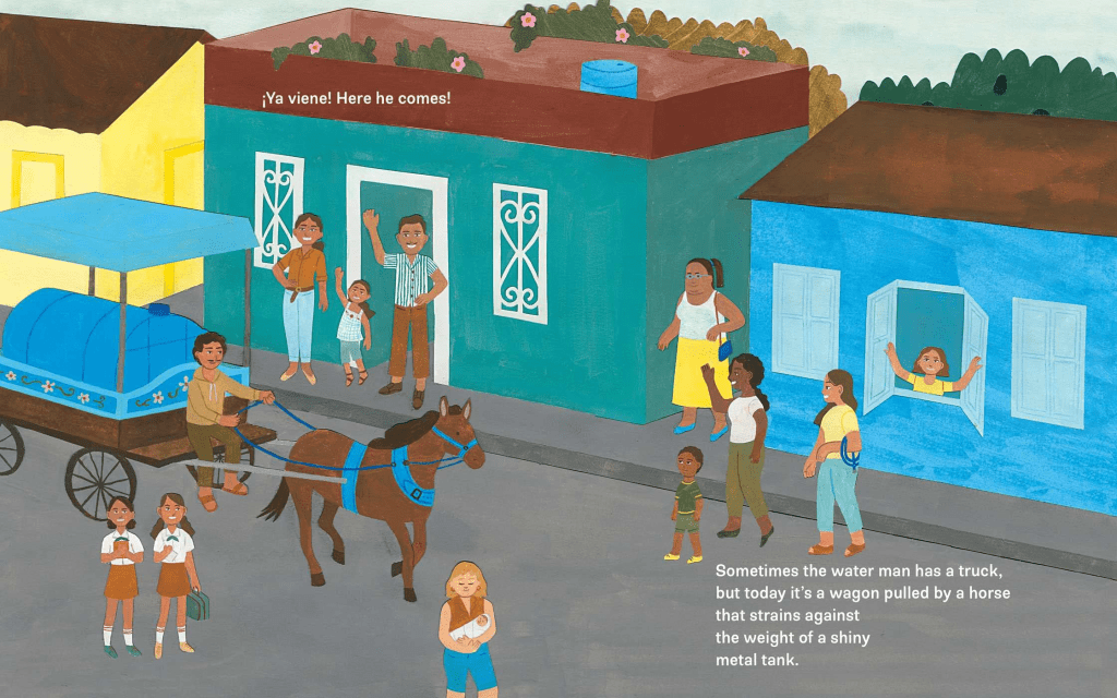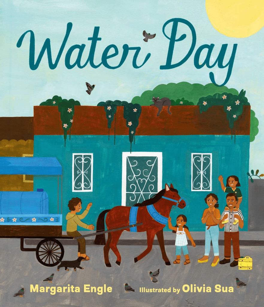 Summary: A young girl describes the excitement of water day, when a man comes to her Cuban neighborhood to deliver water. The family needs water to bathe, cook, drink, and flush the toilet. Bisabuelita (great-grandmother) remembers her childhood when rain fell every day, filling the water tanks. “What changed? Everything. Weather. Rivers. Groundwater. Lakes.” After the water man arrives and fills their blue tank, the fish lady shows up, selling tiny fish to eat the mosquitoes that come to the water, carrying malaria and other diseases. The girl says good-bye, knowing she will see the water man and fish lady in another five days. Includes an author’s note with additional information about the global water crisis and mosquitofish. 40 pages; ages 4-8.
