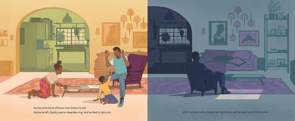 Summary: A family is struggling after the father comes home from a stint in the military. Dad is silent, prone to nightmares, and easily angered. Mom explains PTSD to their young son (the narrator): “When Daddy was away, some bad things happened…Those bad things harmed his mind.” One day, the family goes to the YMCA, where Mom and Dad take a yoga class while the boy watches. Before long, father and son are going every week, gradually getting better at the poses in the class, and Dad makes up the name boyogi for his son. He tells his son that between yoga and therapy, he’s doing a lot better, making the boy feel happier as well. 32 pages; ages 4-8.