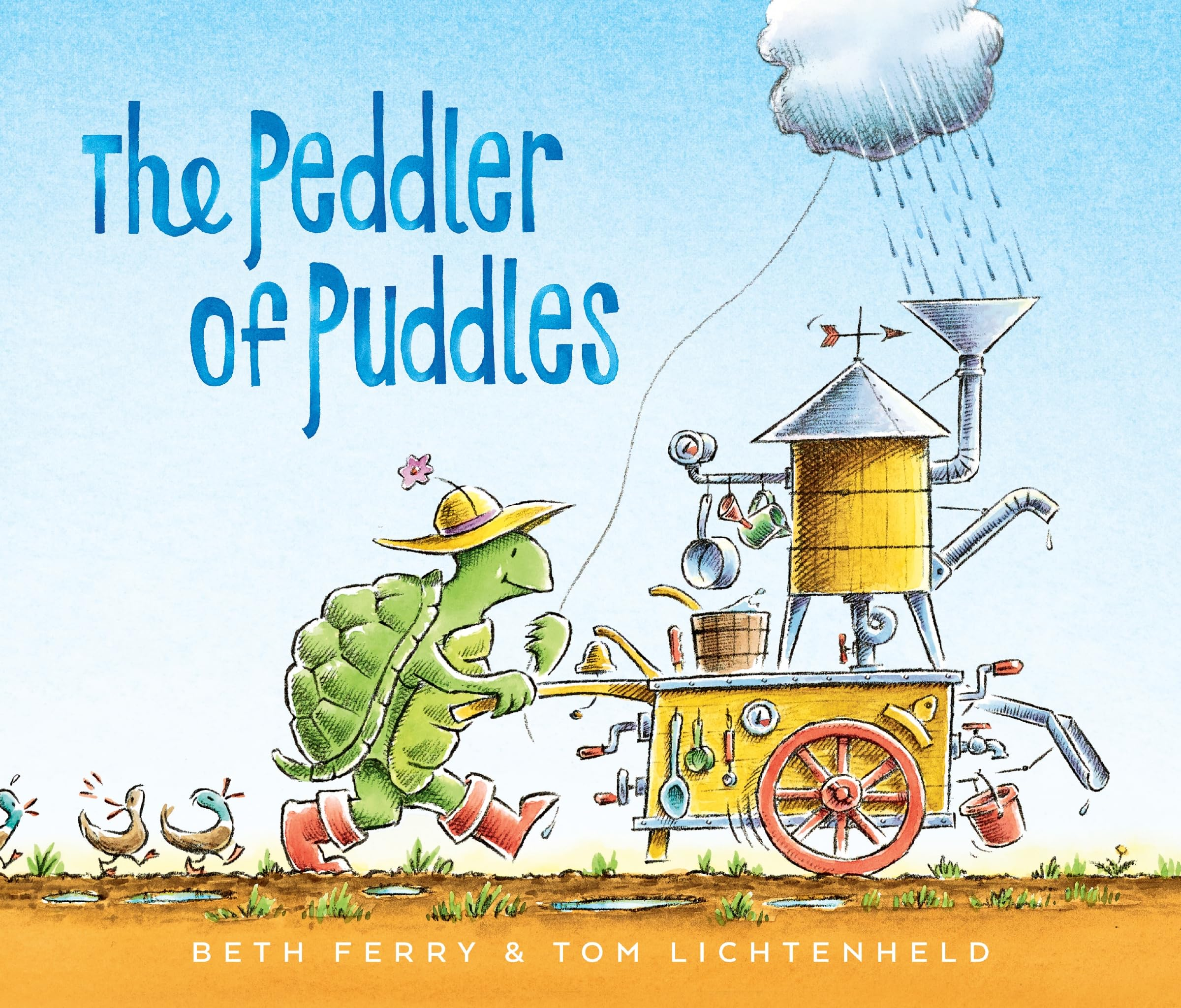 The Peddler of Puddles by Beth Ferry, illustrated by Tom Lichtenheld (Clarion Books, 48 pages, ages 4-8). The peddler is a turtle whose puddle-making machine (complete with a cloud on a string like a balloon) allows him to make custom puddles for his customers, from a tiny one for a hummingbird to ones large enough for hundreds of frogs or for a child to sail a boat across. Everyone loves the peddler, but he’s constantly on the move, never staying in one place for long. One day, he goes to the seashore where he sees the biggest puddle ever and befriends a girl who shows him how to play in the ocean. When she tells him she has to go home, the peddler feels sad because he realizes he doesn’t have a home. Over the horizon appear his friends, looking for him. They help him dig his cart out of the sand and lead him back to their forest. There, they’ve dug a huge hole, which the peddler fills with water, and they all work together to turn his cart into a new house. His house and the pond become a home for the turtle and all of his friends.