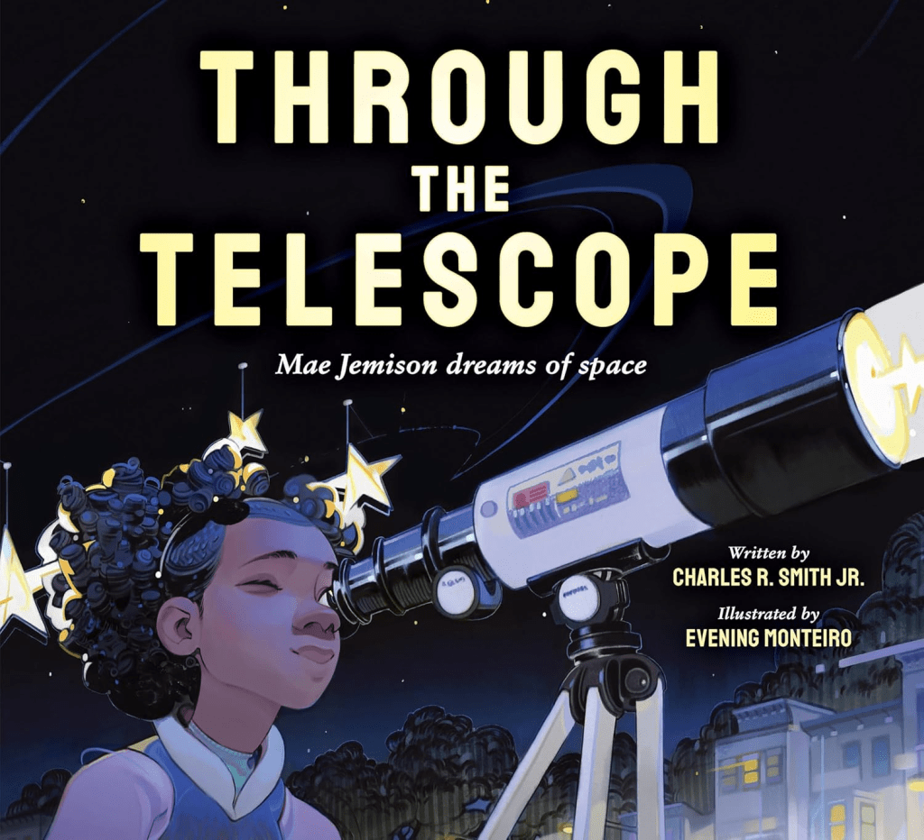 Through the Telescope: Mae Jemison Dreams of Space by Charles R. Smith, Jr., illustrated by Evening Monteiro (Orchard Books, 40 pages, ages 4-8). A young Mae Jemison peers through the telescope, dreaming of traveling into space, while rhyming text and illustrations explain what she sees: the moon, planets, constellations, and galaxies.