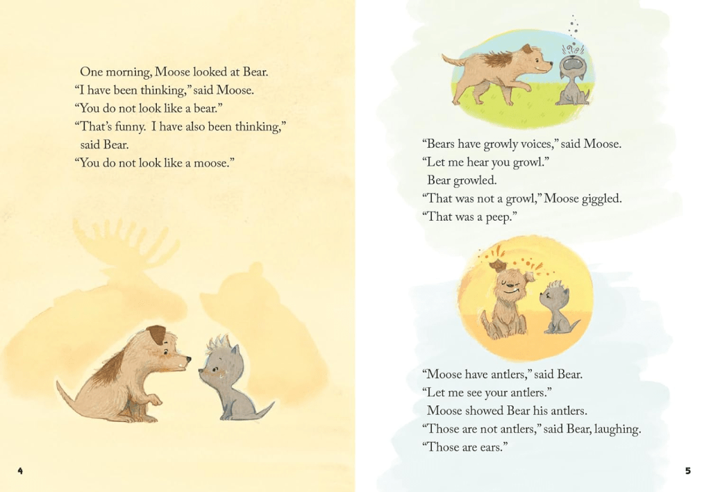 Summary: In three chapters, readers learn about one-eyed Moose and three-legged Bear, two dogs who become friends at a shelter. A woman named Cathy adopts them at the end of the first chapter, and a stray cat named Tiger joins the family in chapter two. In the final story, it’s bedtime for the three friends, but Tiger is too anxious to sleep in his new home. After trying a few unsuccessful solutions, the three pets happily snuggle up together in the dogs’ bed for the night. 40 pages; grades K-2.